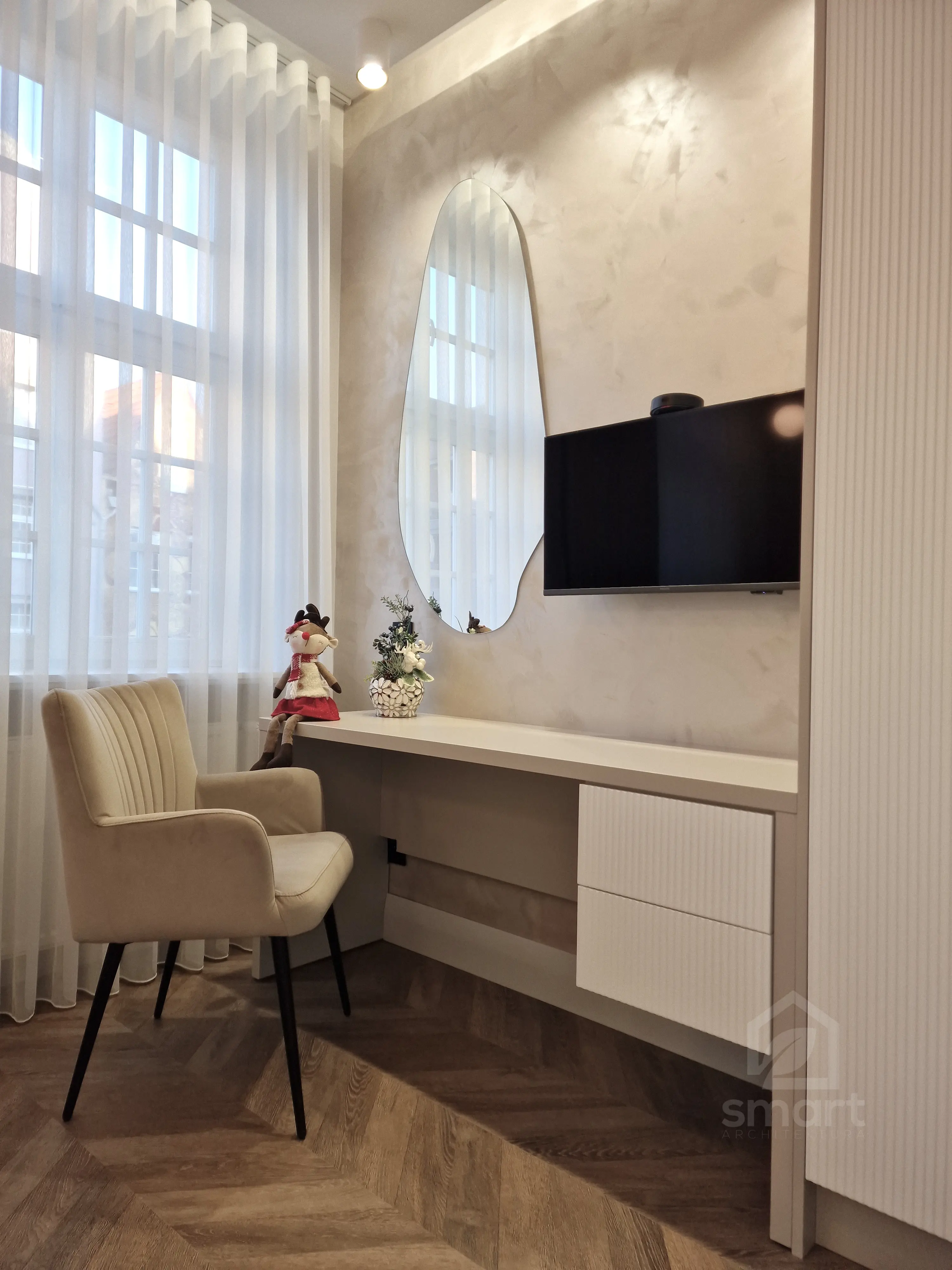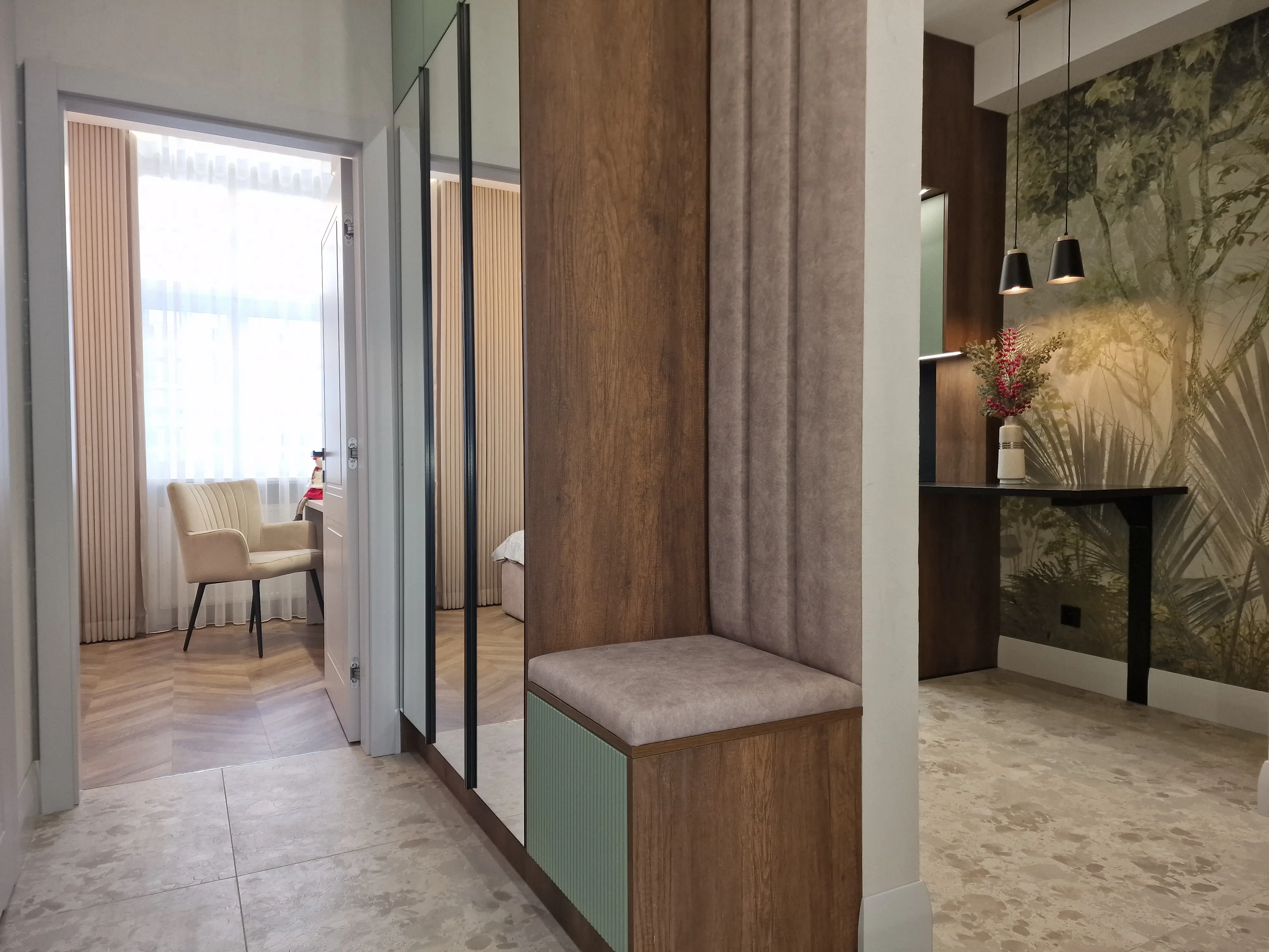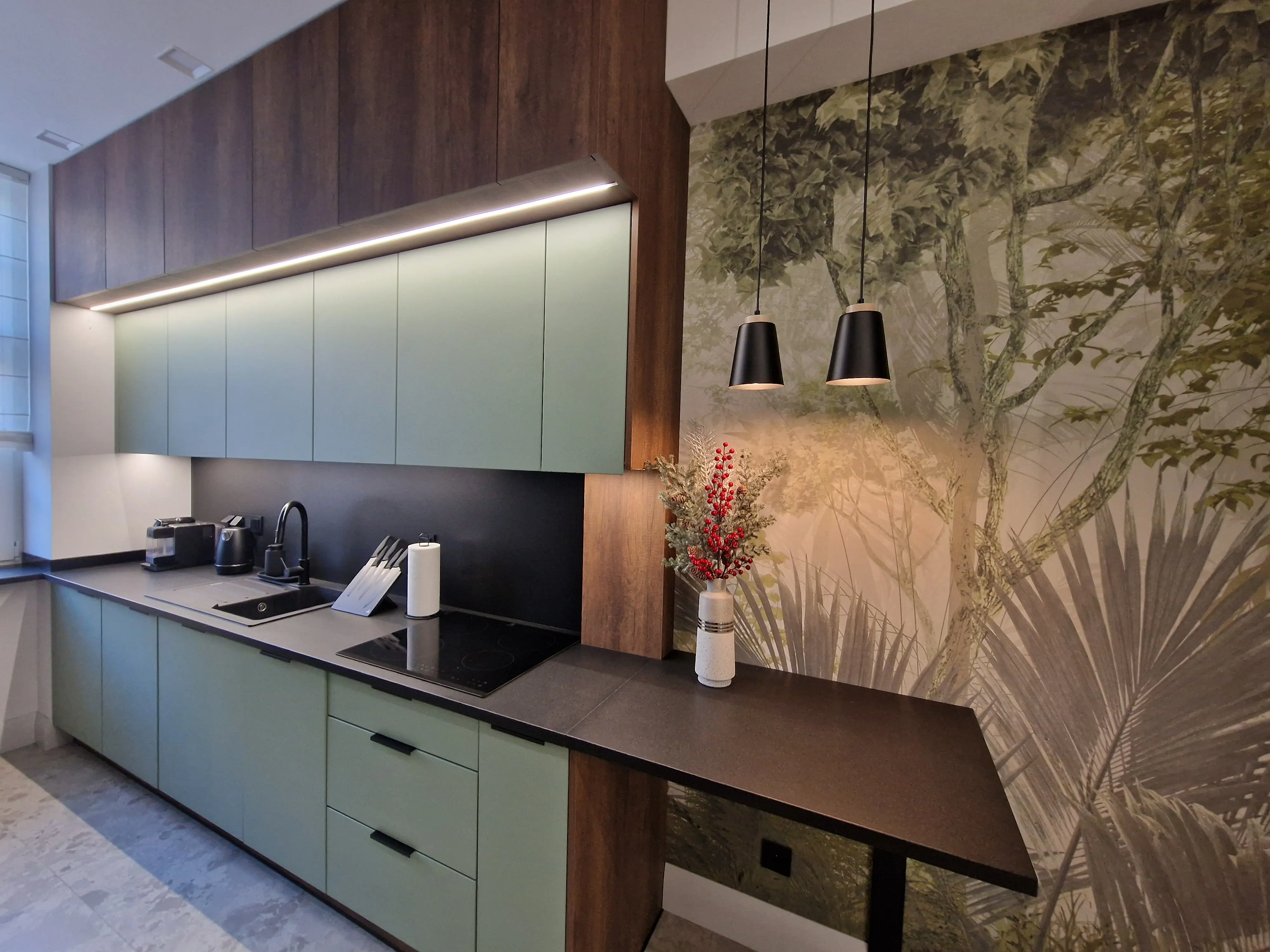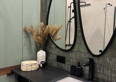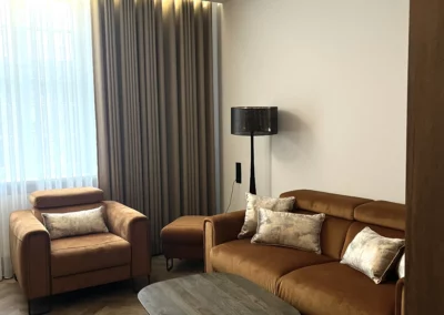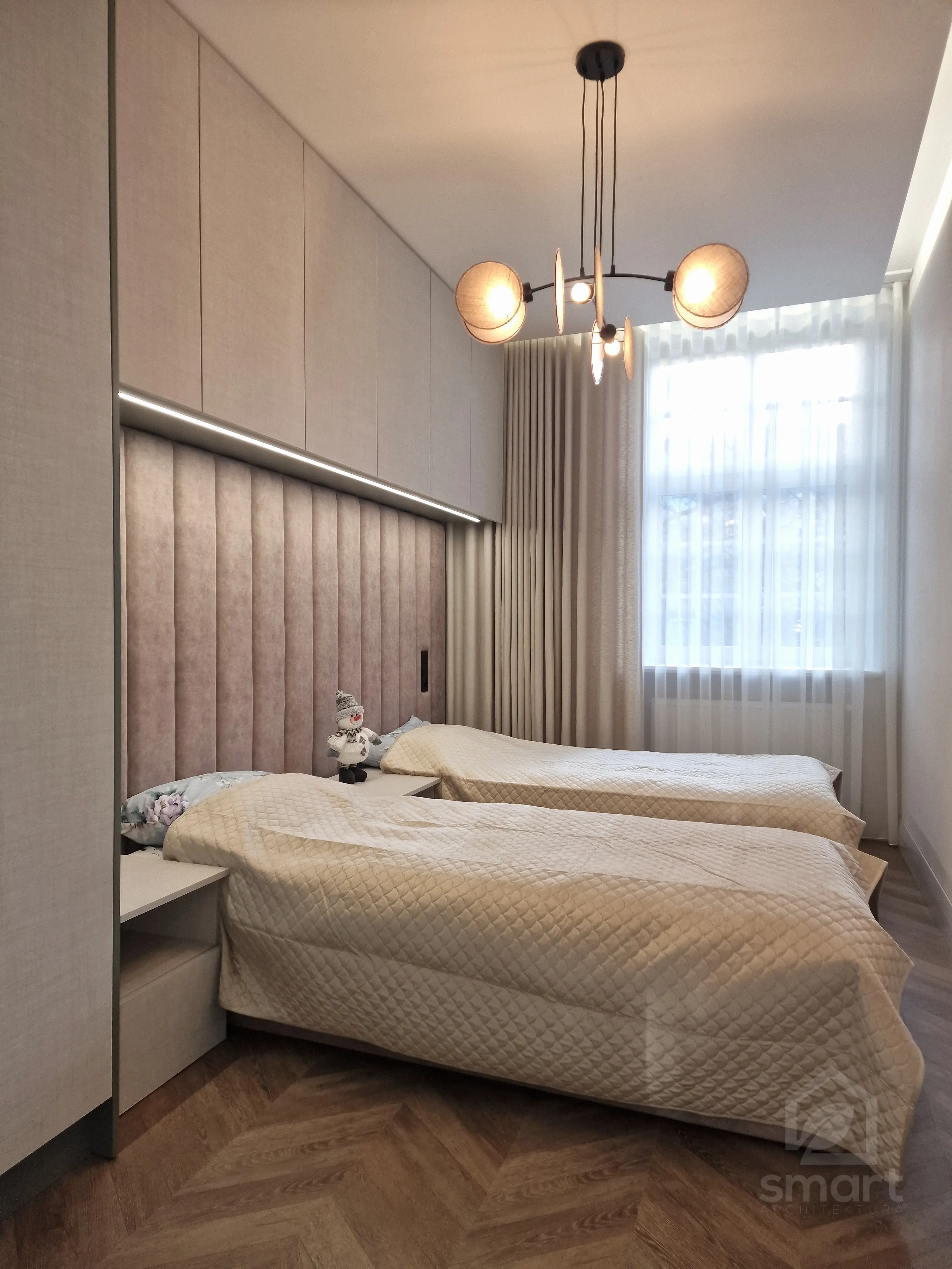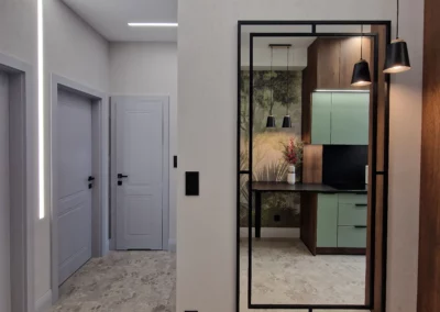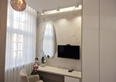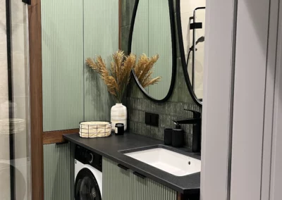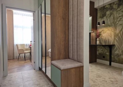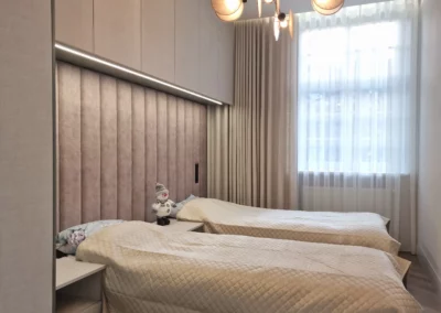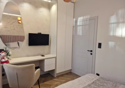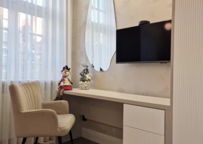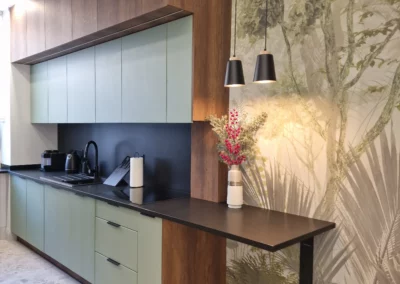 Meble wykonano z ekologicznych płyt drewnianych, a akcenty kolorystyczne w odcieniach beżu, mokki i oliwki dopełniają wnętrze, nadając mu elegancji i nowoczesnego charakteru.