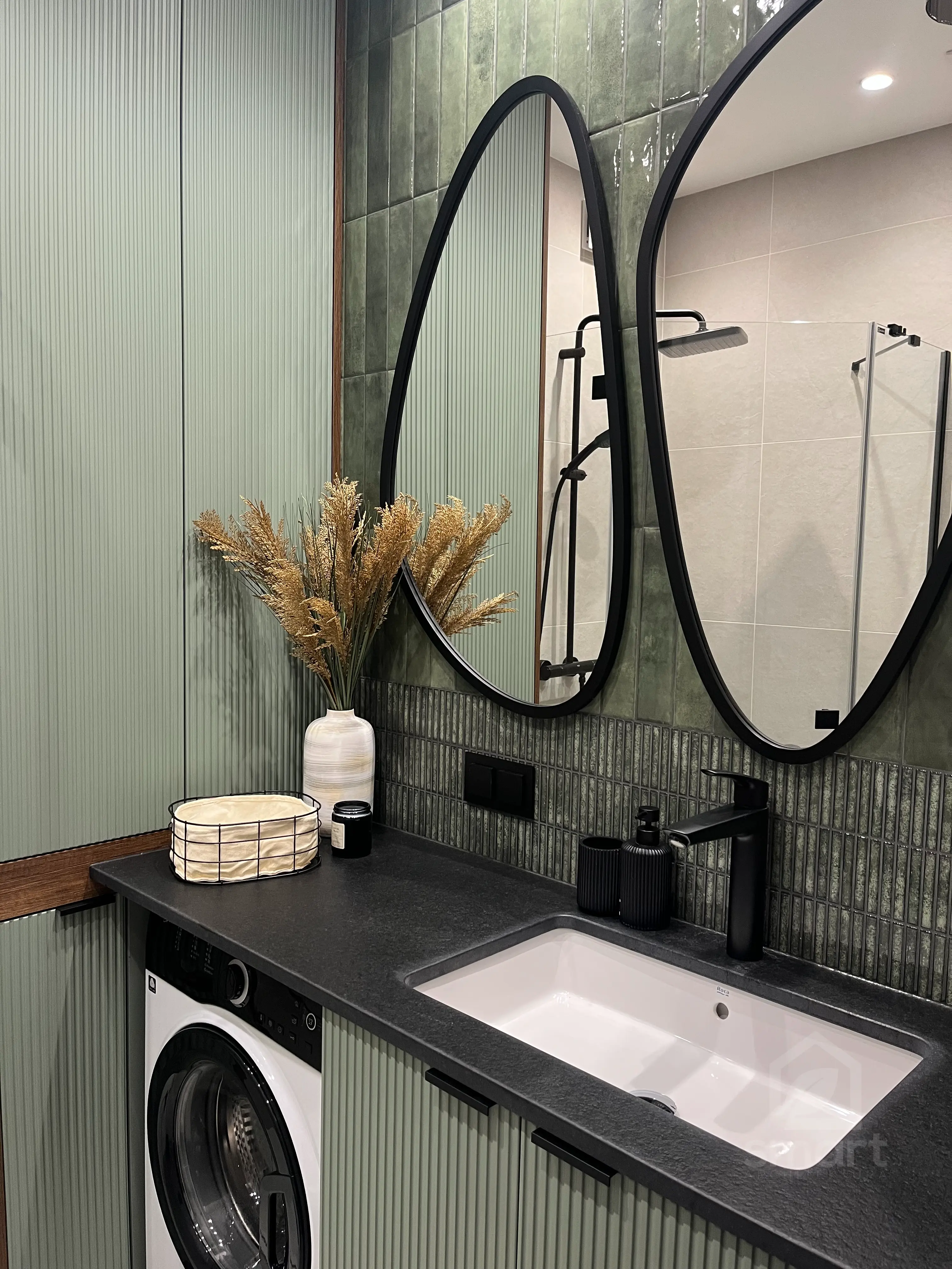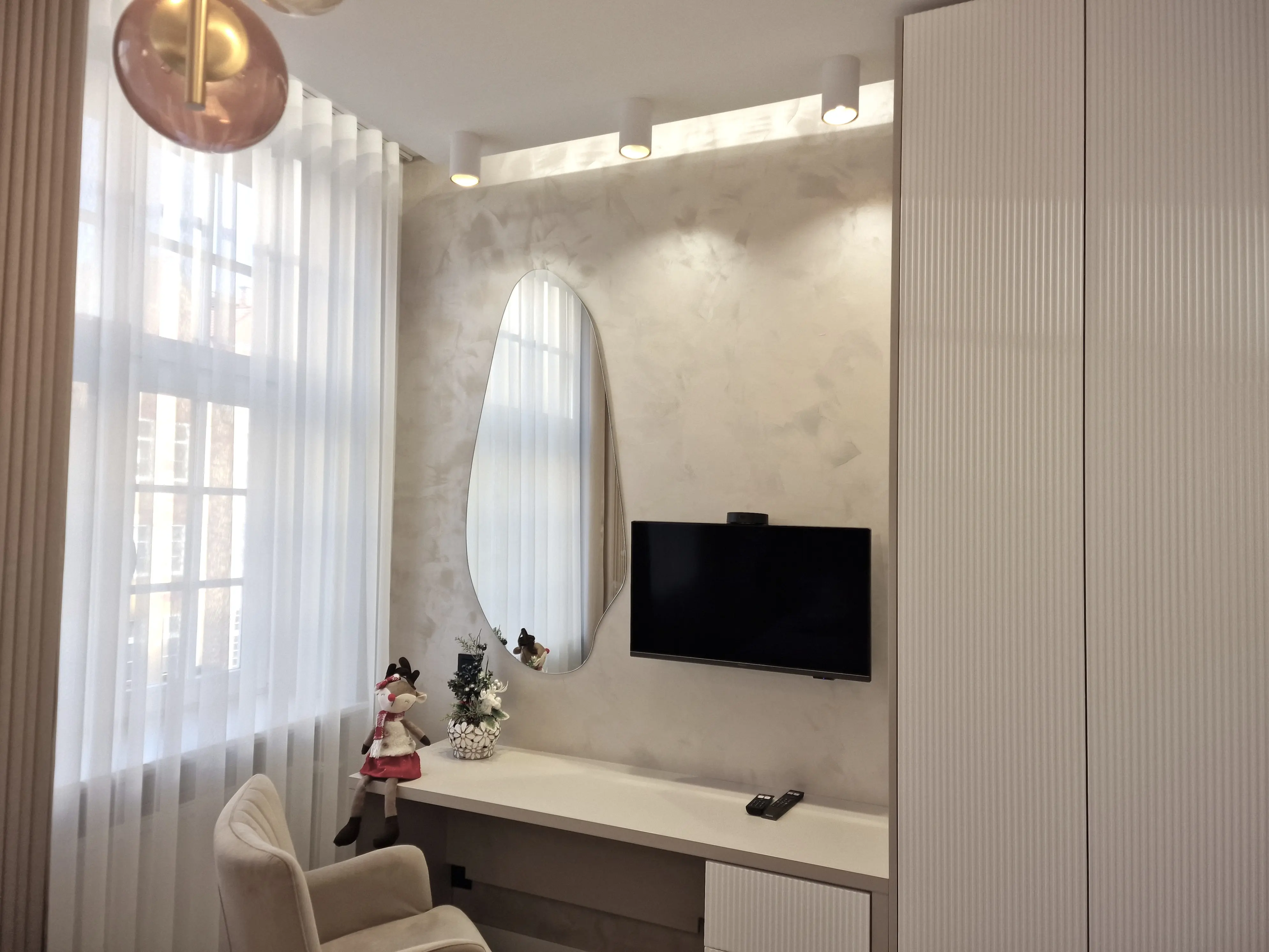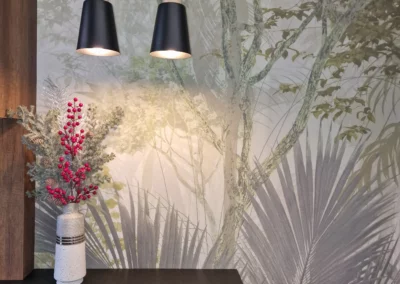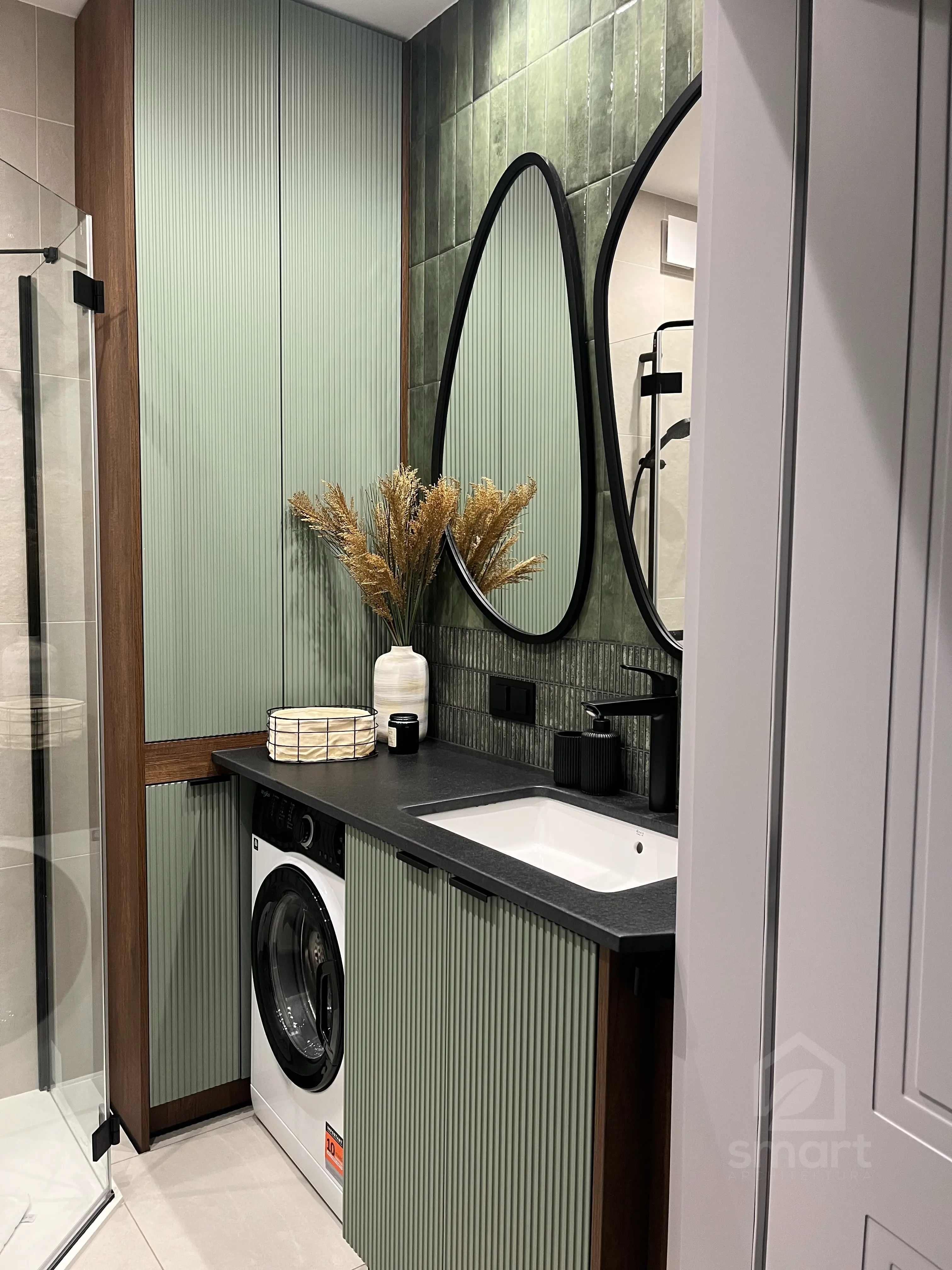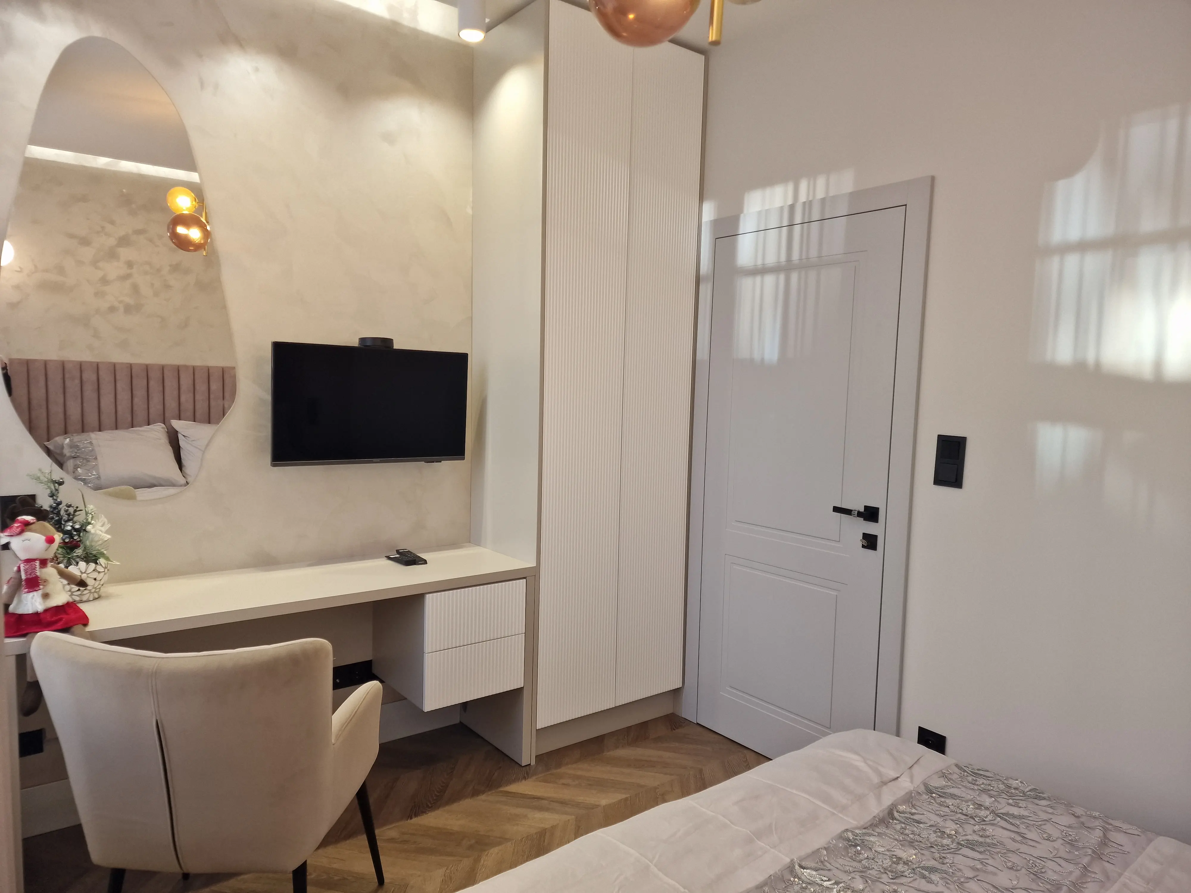 Meble wykonano z ekologicznych płyt drewnianych, a akcenty kolorystyczne w odcieniach beżu, mokki i oliwki dopełniają wnętrze, nadając mu elegancji i nowoczesnego charakteru.