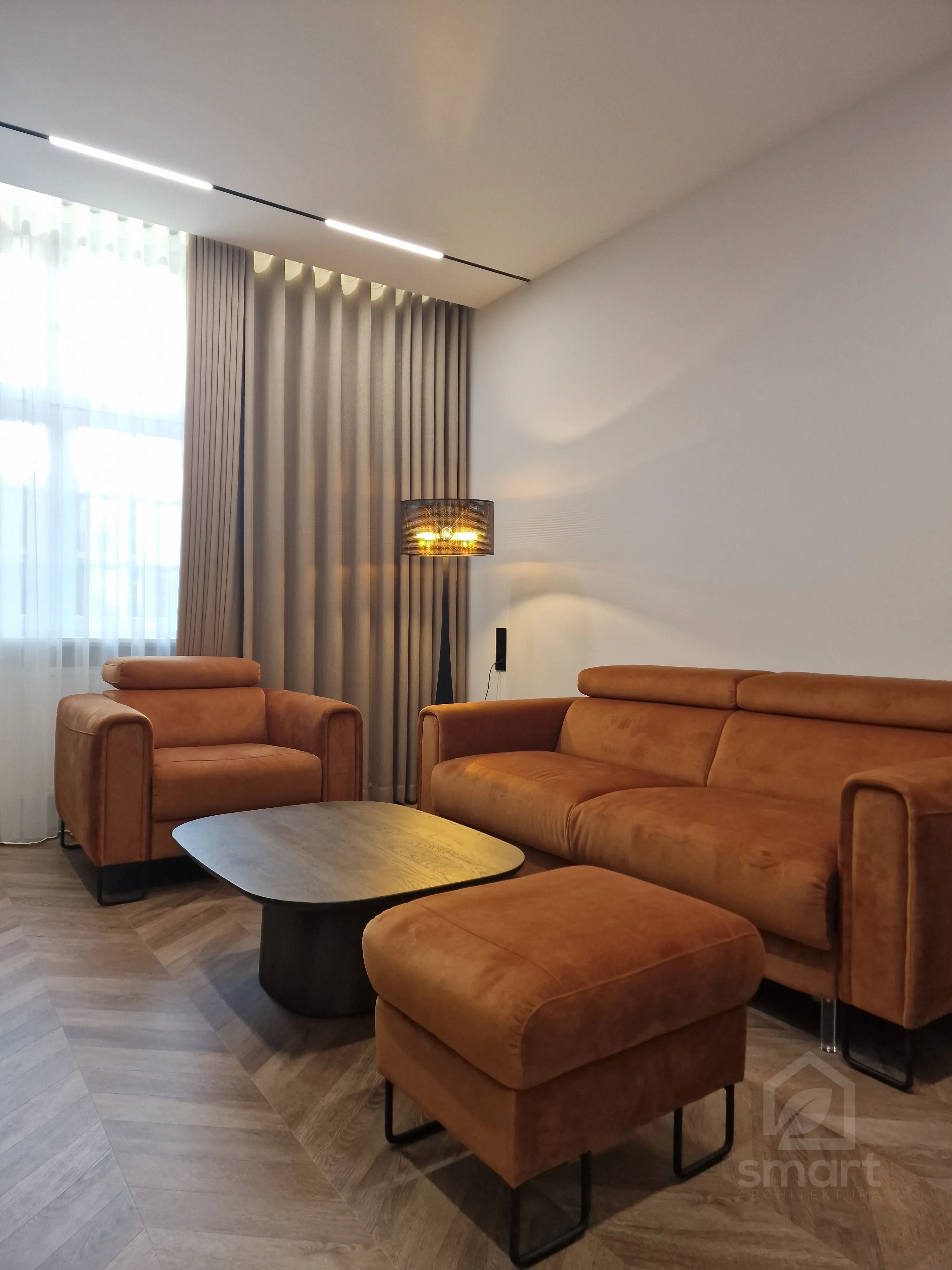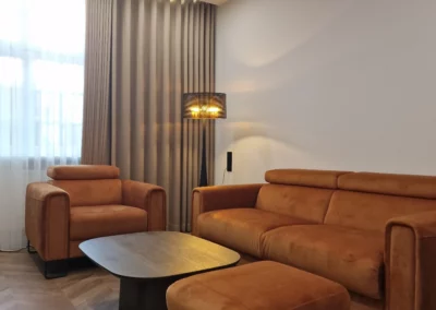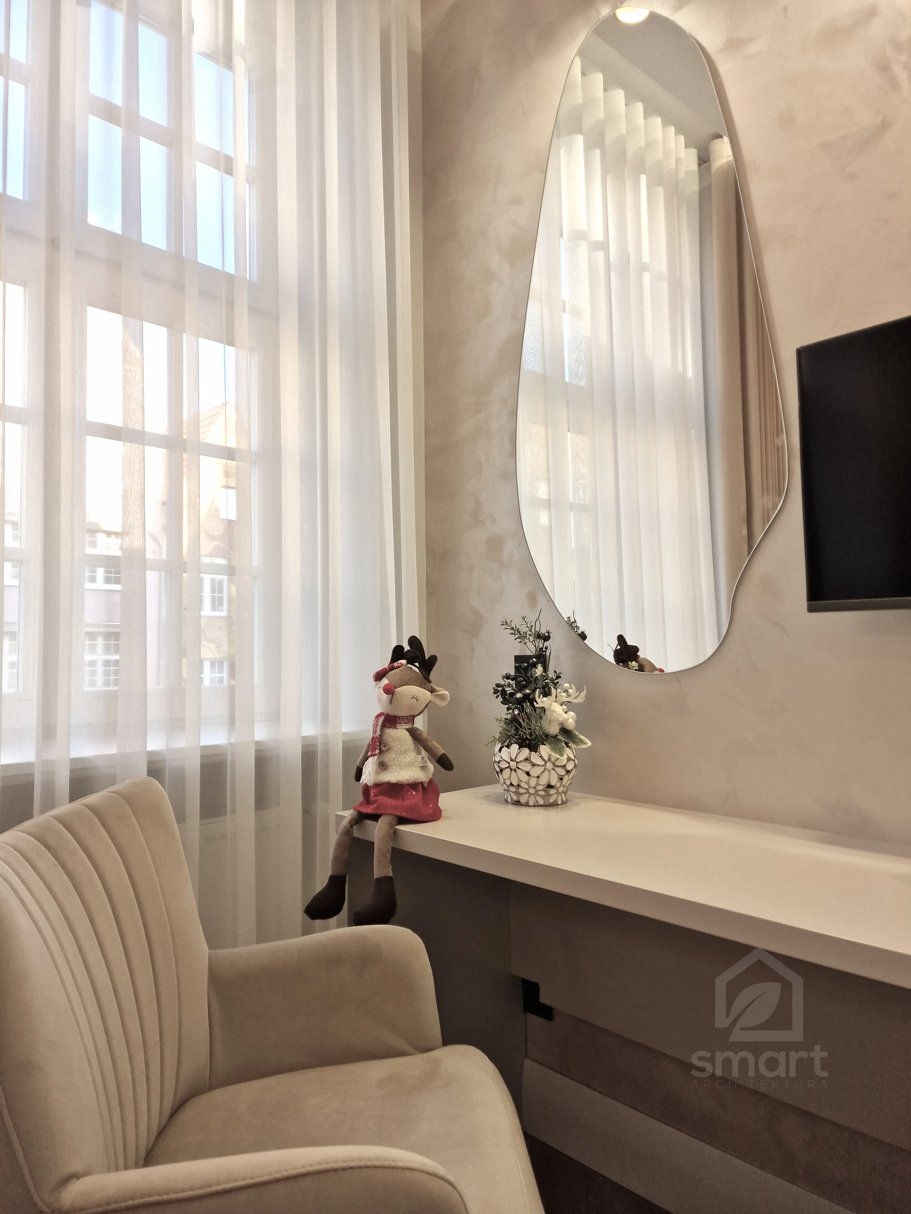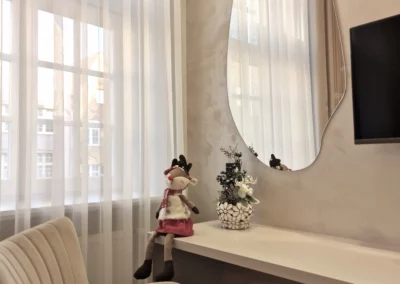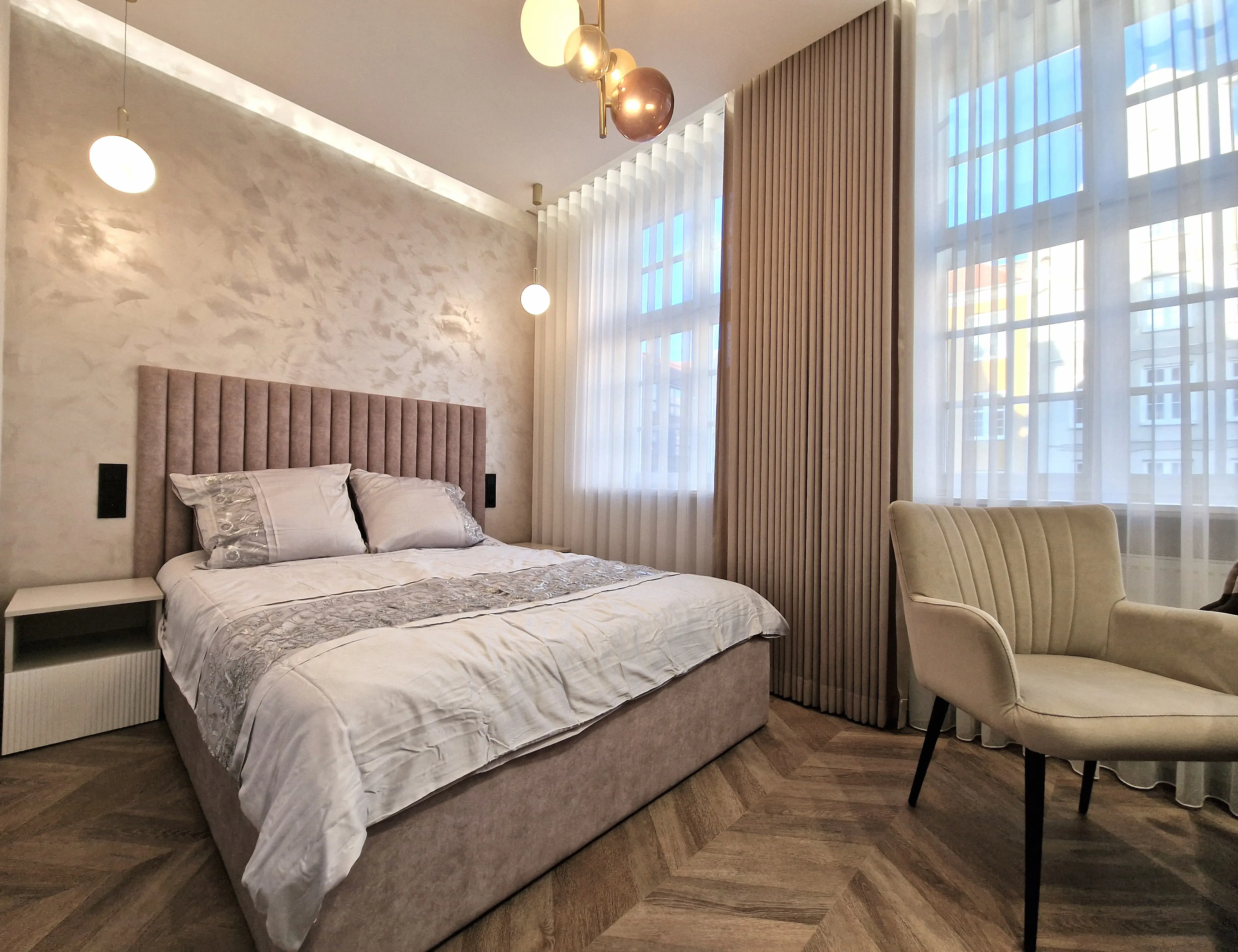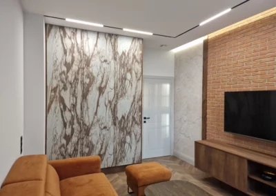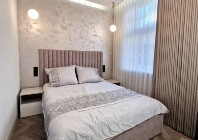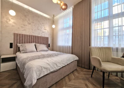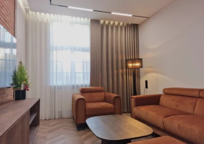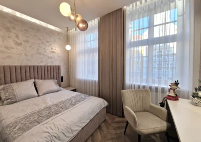 Celem było stworzenie nowoczesnego apartamentu, który jednocześnie oddaje charakter zabytkowego otoczenia chronionego przez Konserwatora Zabytków. W aranżacji wnętrza zastosowano połączenie cegły z tynkami strukturalnymi oraz elementami drewna. Klasyczny parkiet zastąpiono jodełką francuską w pokojach i salonie, natomiast w korytarzu i kuchni wykorzystano gresy inspirowane naturalnym kamieniem brukowanych ulic Starego Miasta.